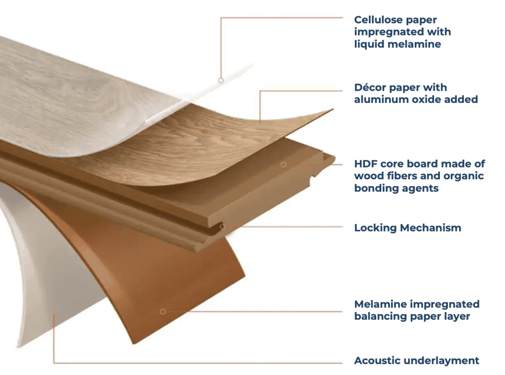 Instead of a rigid stone-plastic composite core, laminate flooring is built around a high-density fiberboard (HDF). HDF material is made from recycled wood fibers and high-quality resins that are compressed and formed into a dense and robust core board.