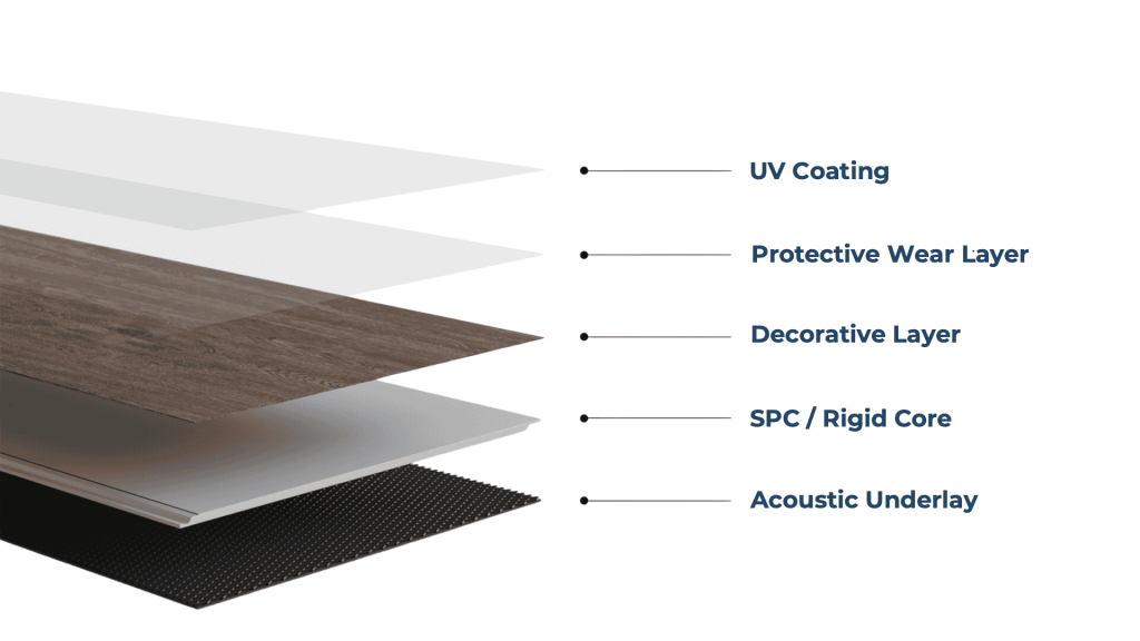 On top of our wood composite core is a high-definition visual layer underneath a textured wear layer, and the finish coating provides AC5-level scratch and abrasion resistance (the highest residential level).