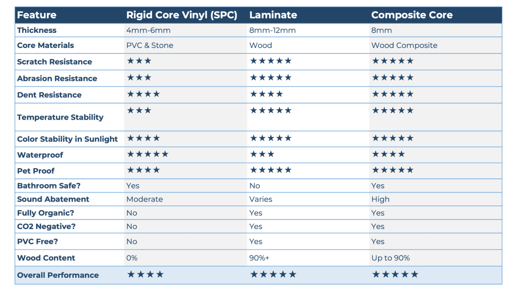 - Rigid Core can be strong but brittle, and the locking mechanism can be easily damaged during installation, leading to higher rates of boards separating over time.