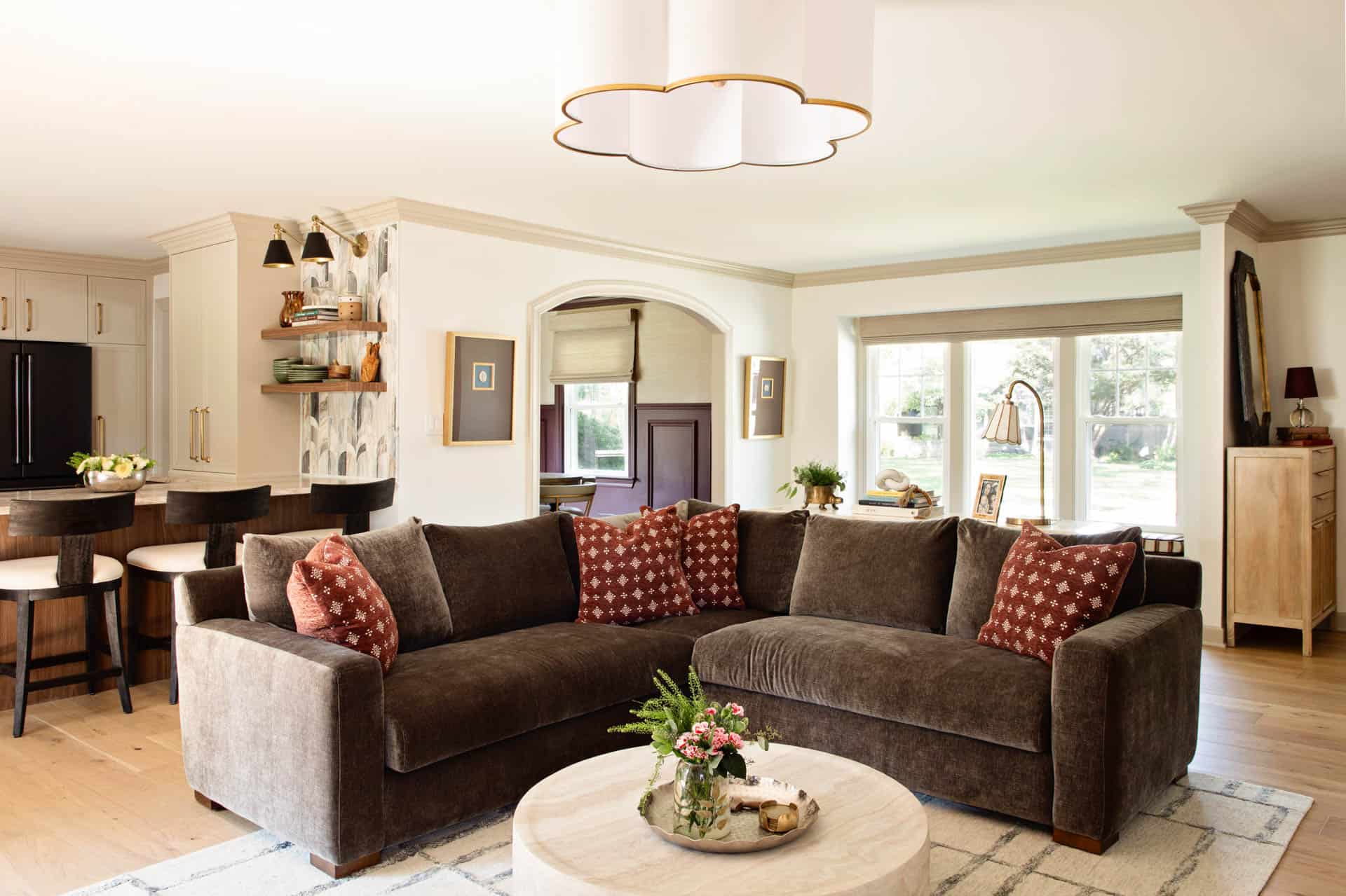 In the living room, the earthy, sophisticated palette invites you to pause and relax. Neutral layers balance the furnishings’ deep tones and gold finishes lend subtle glam, a signature of Day’s “laid-back luxe” style. The flooring carries warmth seamlessly throughout, echoing the walnut cabinetry in the adjoining kitchen.