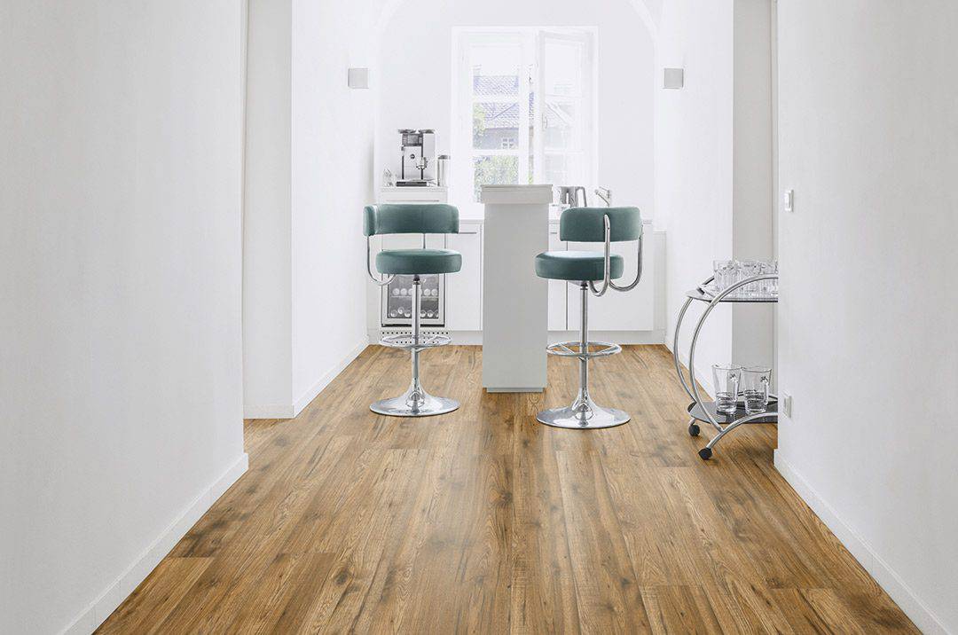 Offers lasting durability, water resistance, and the authentic look of brushed wood grain. Rich in medium to deep brown tones, these 7.6″ wide planks feature embossed-in-register texturing for a realistic, natural surface. Built with EuroCor920 construction and protected by the TriSeal watersafe system, Wels delivers strength and reliability for busy homes. At 8mm thick with an attached 2mm pad, an AC4 wear rating, and easy REALock angle tap locking, this floor combines resilience, beauty, and simple installation.