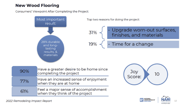 In addition, 90% of consumers reported a greater desire to be home, and 77% said they had an increased sense of enjoyment after refinishing or putting in new wood floors. By every measure, wood floors are an excellent financial investment, leading to a more enjoyable living experience.