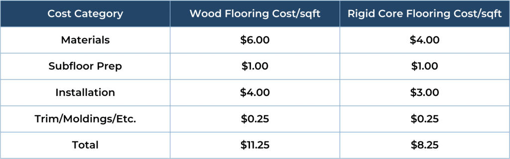 In this common scenario, choosing a rigid core floor to avoid the 50% increase in materials cost only saves 25% on the project’s total cost while sacrificing the beauty and longevity of the finished product as well as the market value of the home.