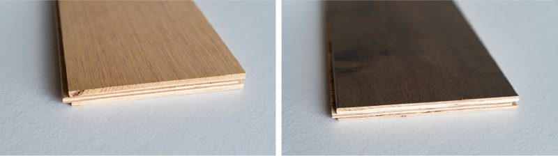 Unfinished engineered oak flooring on left, prefinished on right.